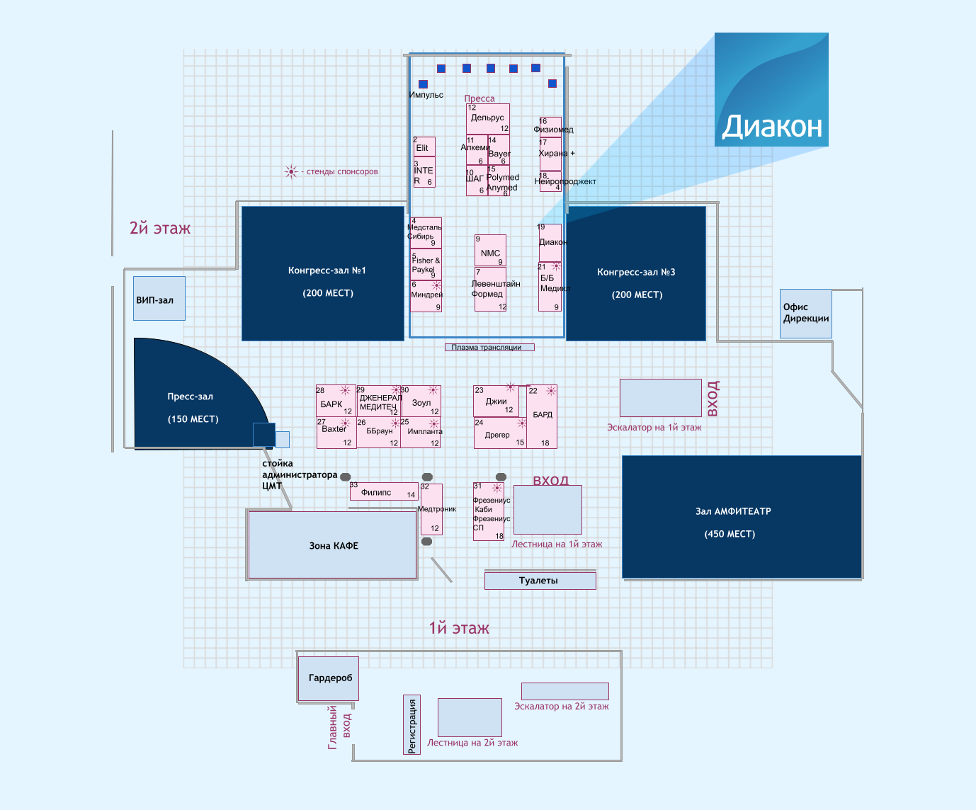 АО «ДИАКОН» участвует в форуме со стендом, на котором будут демонстрироваться аналитические системы PATHFAST, ESCHWEILER MODULAR Pro и Easy Reader+. Стенд компании показан на схеме.