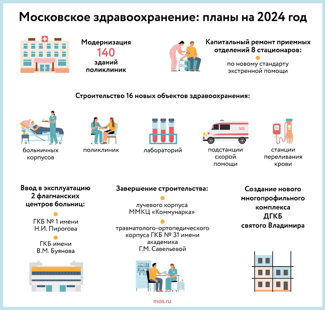 В 2024 году в Москве запланировано строительство 16 новых объектов здравоохранения, включая клинико-диагностические лаборатории и станции переливания крови. На развитие высокотехнологичной медпомощи направят 34 млрд рублей, а на цифровизацию здравоохранения еще 5,8 млрд.